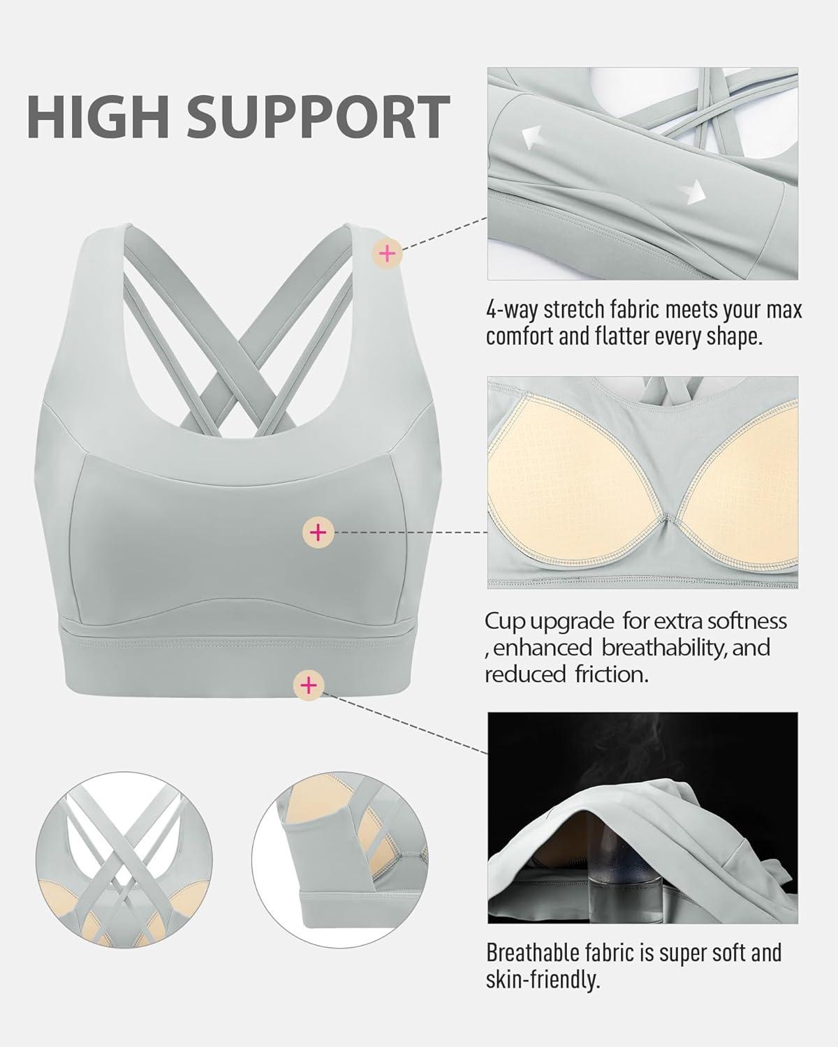 RUNNING GIRL High Impact Sports Bras for Women – Scoop Neck Strappy Sports Bra High Support Moulded Cup Workout Bra(Ice Grey)