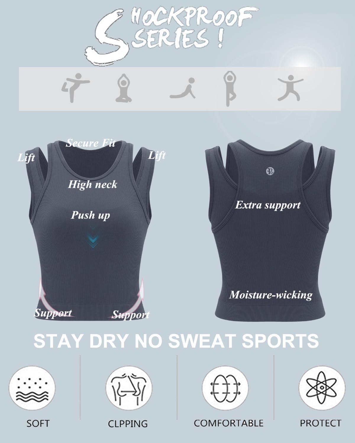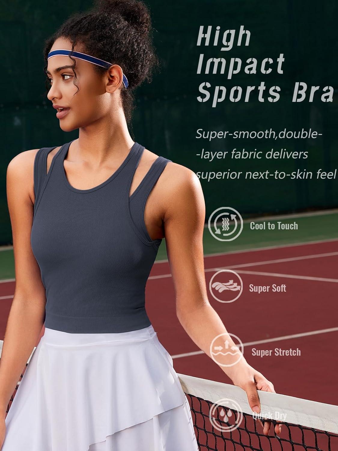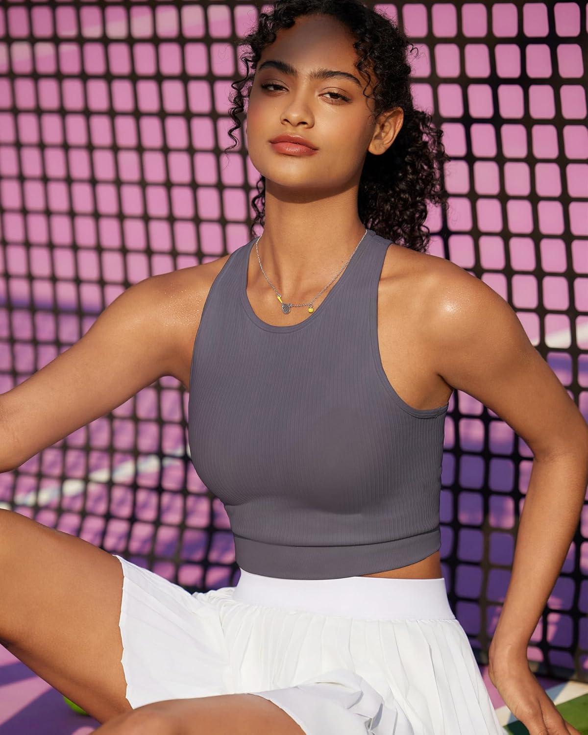 RUNNING GIRL Sports Bras for Women High Impact Seamless Ribbed Longline High Neck Workout Crop Tank Tops Padded(A-dark Grey)
