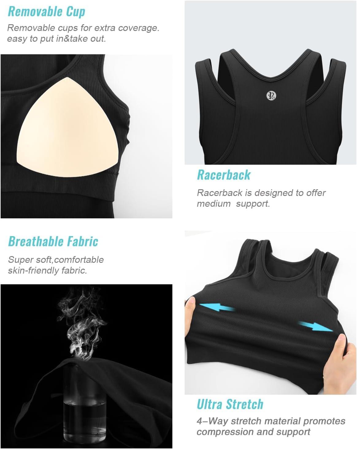 RUNNING GIRL Sports Bras for Women High Support,Seamless Ribbed Longline High Neck Sports Bra Racerback Padded Crop Top Yoga(B-black)