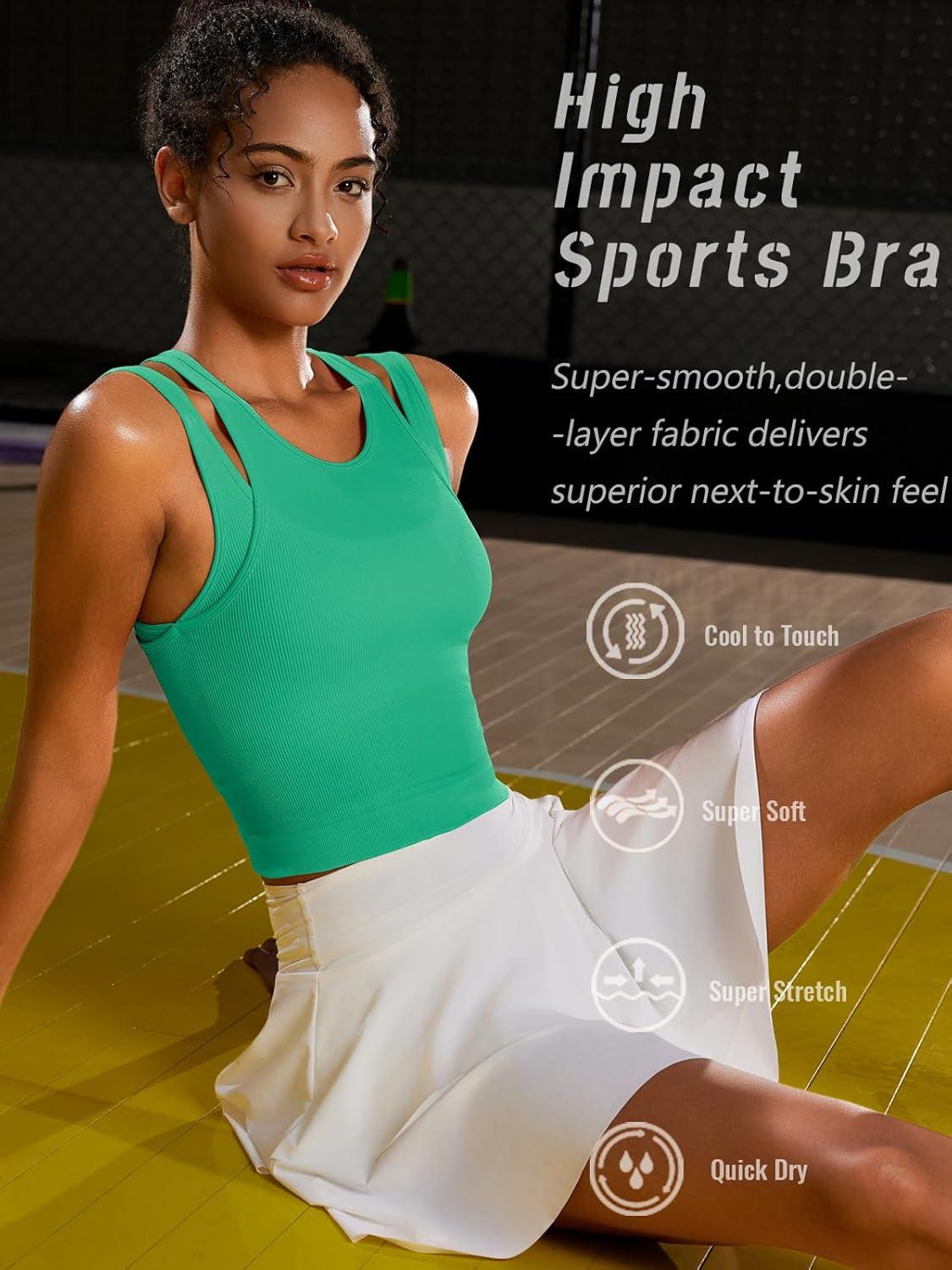 RUNNING GIRL Sports Bras for Women High Support,Seamless Ribbed Longline High Neck Sports Bra Racerback Padded Crop Top Yoga(A-dark Green)