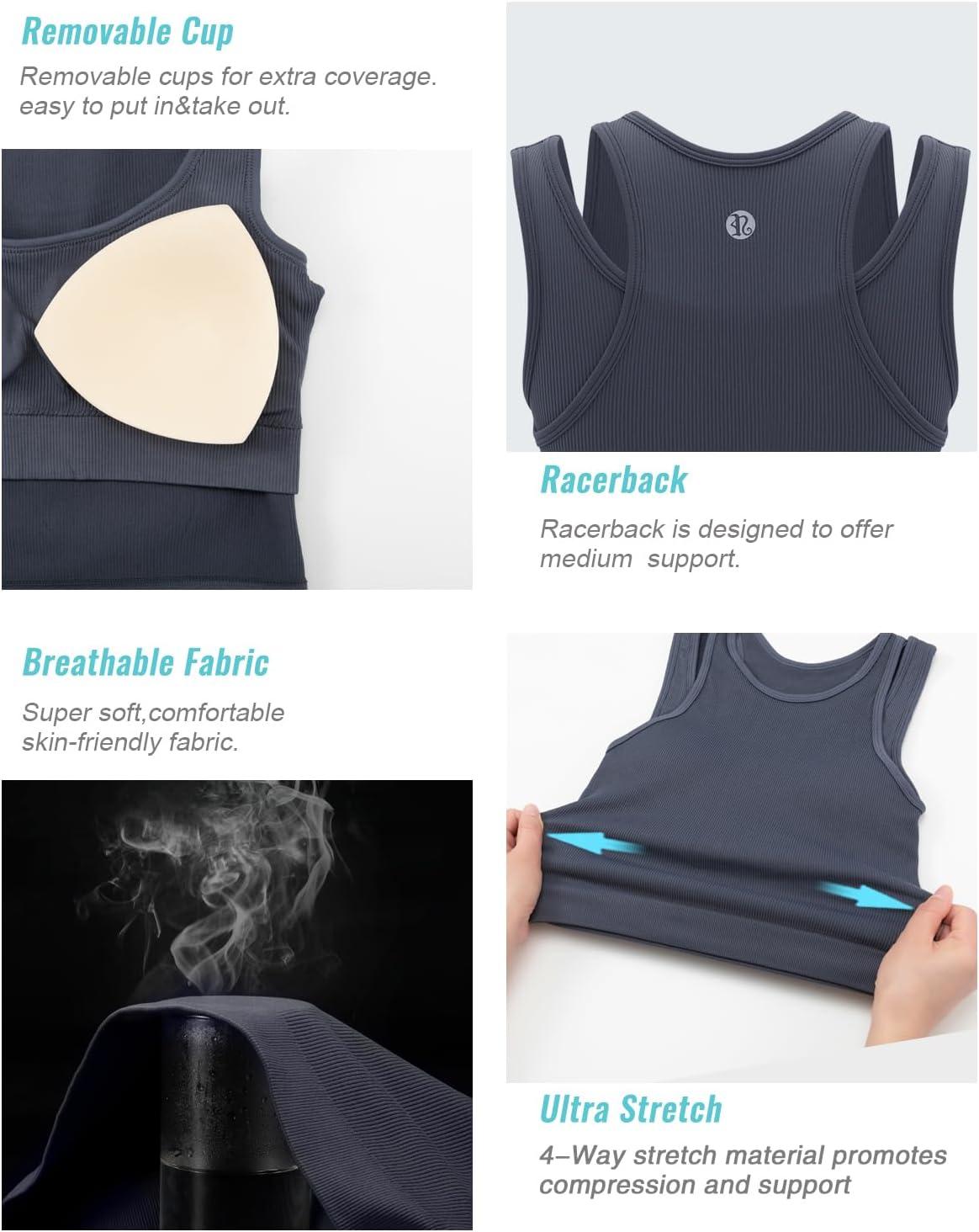 RUNNING GIRL Sports Bras for Women High Support,Seamless Ribbed Longline High Neck Sports Bra Racerback Padded Crop Top Yoga(A-dark Grey)