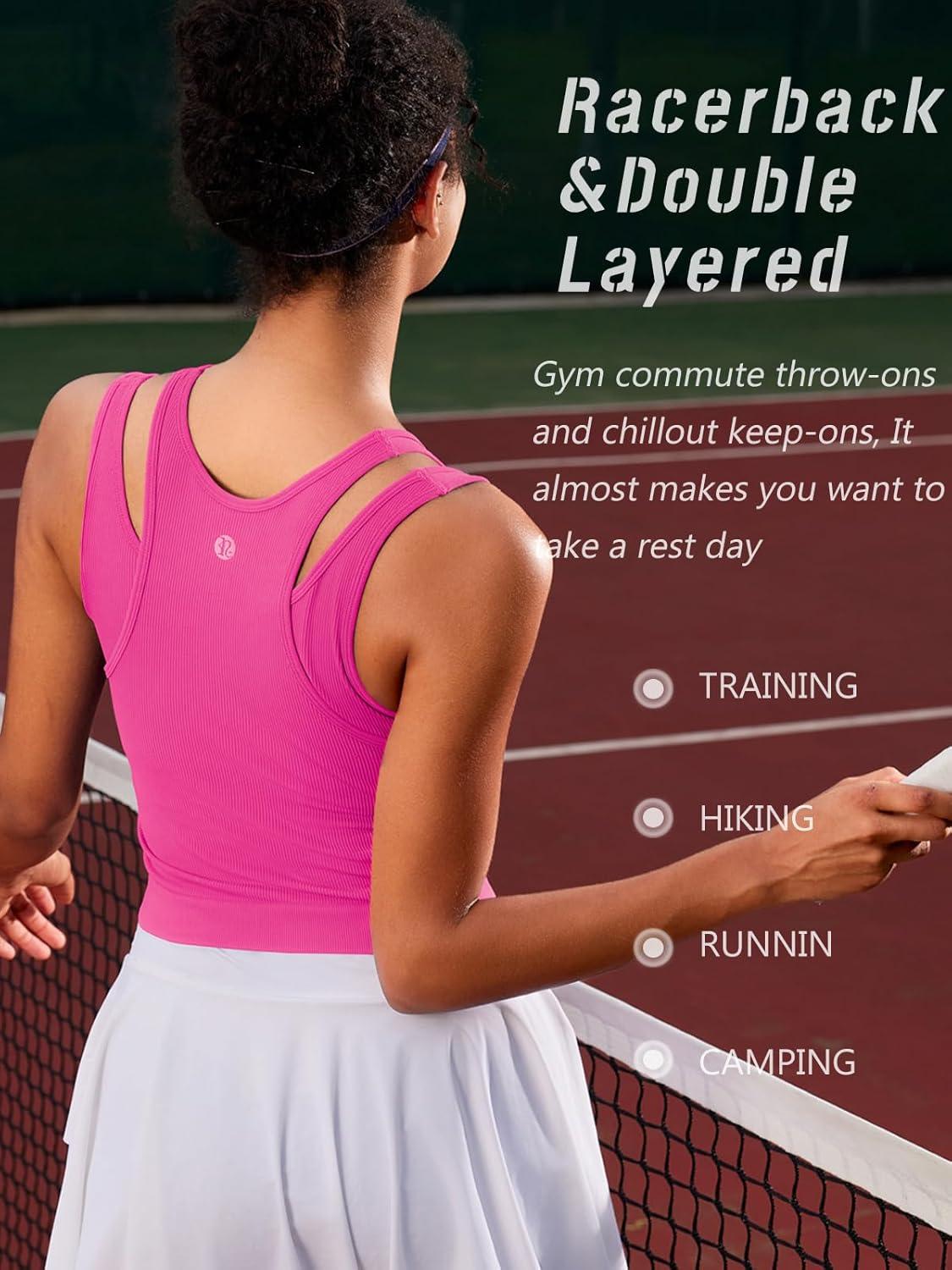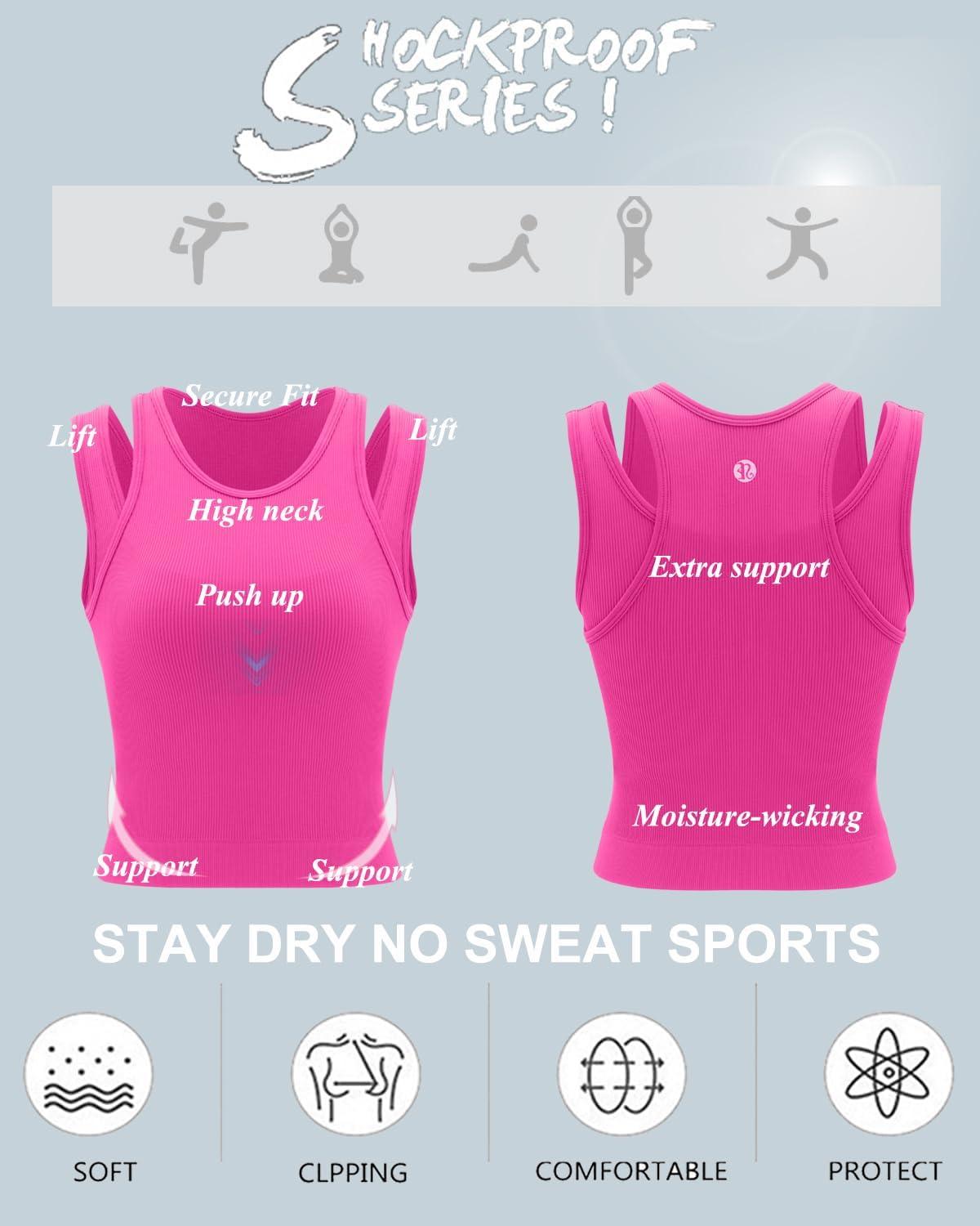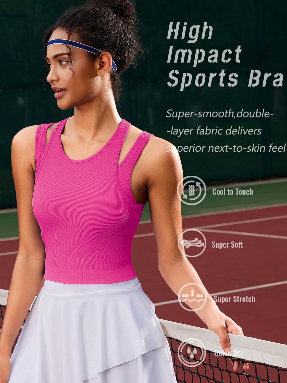 RUNNING GIRL Sports Bras for Women High Impact Seamless Ribbed Longline High Neck Workout Crop Tank Tops Padded(B-hot Pink)
