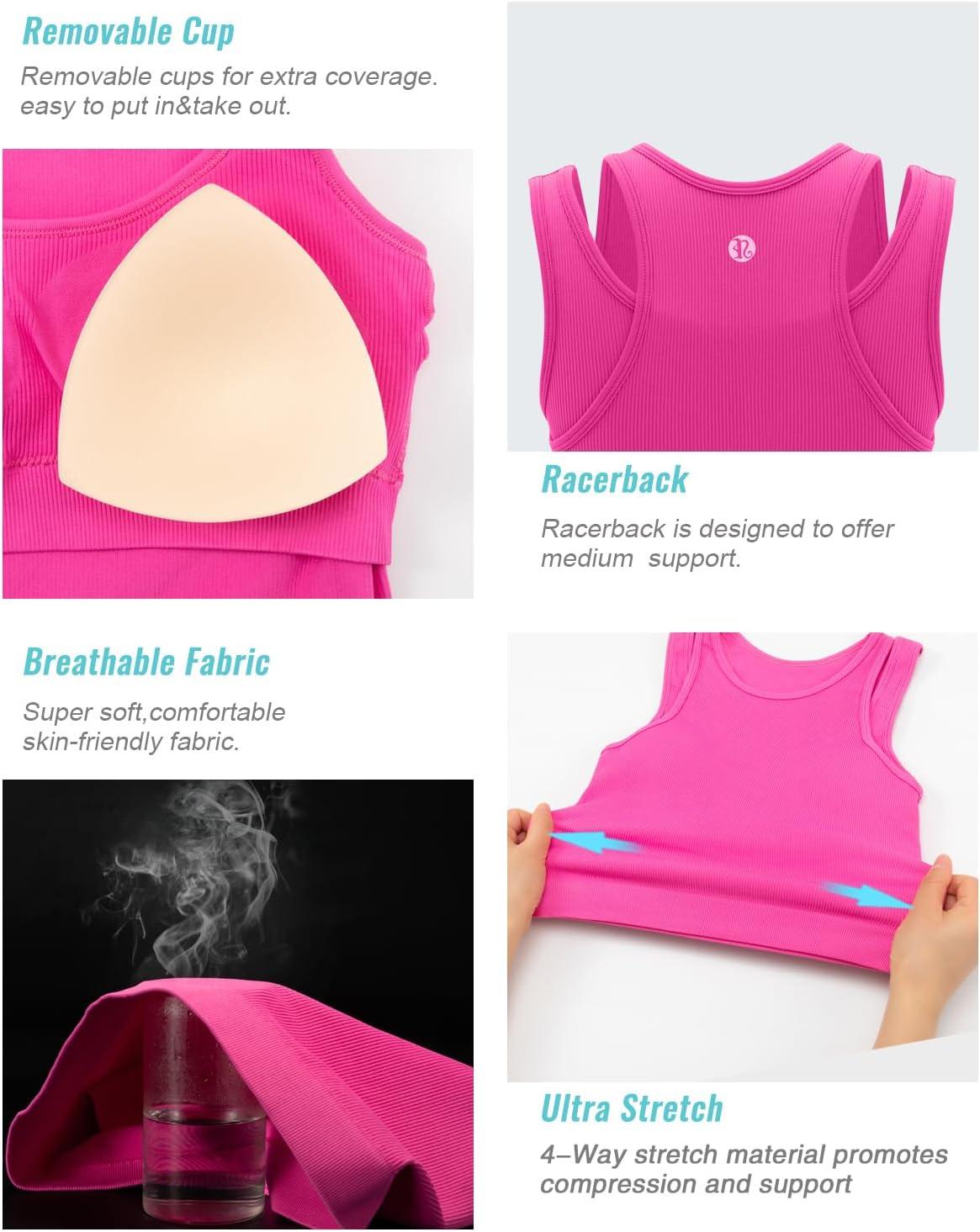 RUNNING GIRL Sports Bras for Women High Support,Seamless Ribbed Longline High Neck Sports Bra Racerback Padded Crop Top Yoga(B-hot Pink)