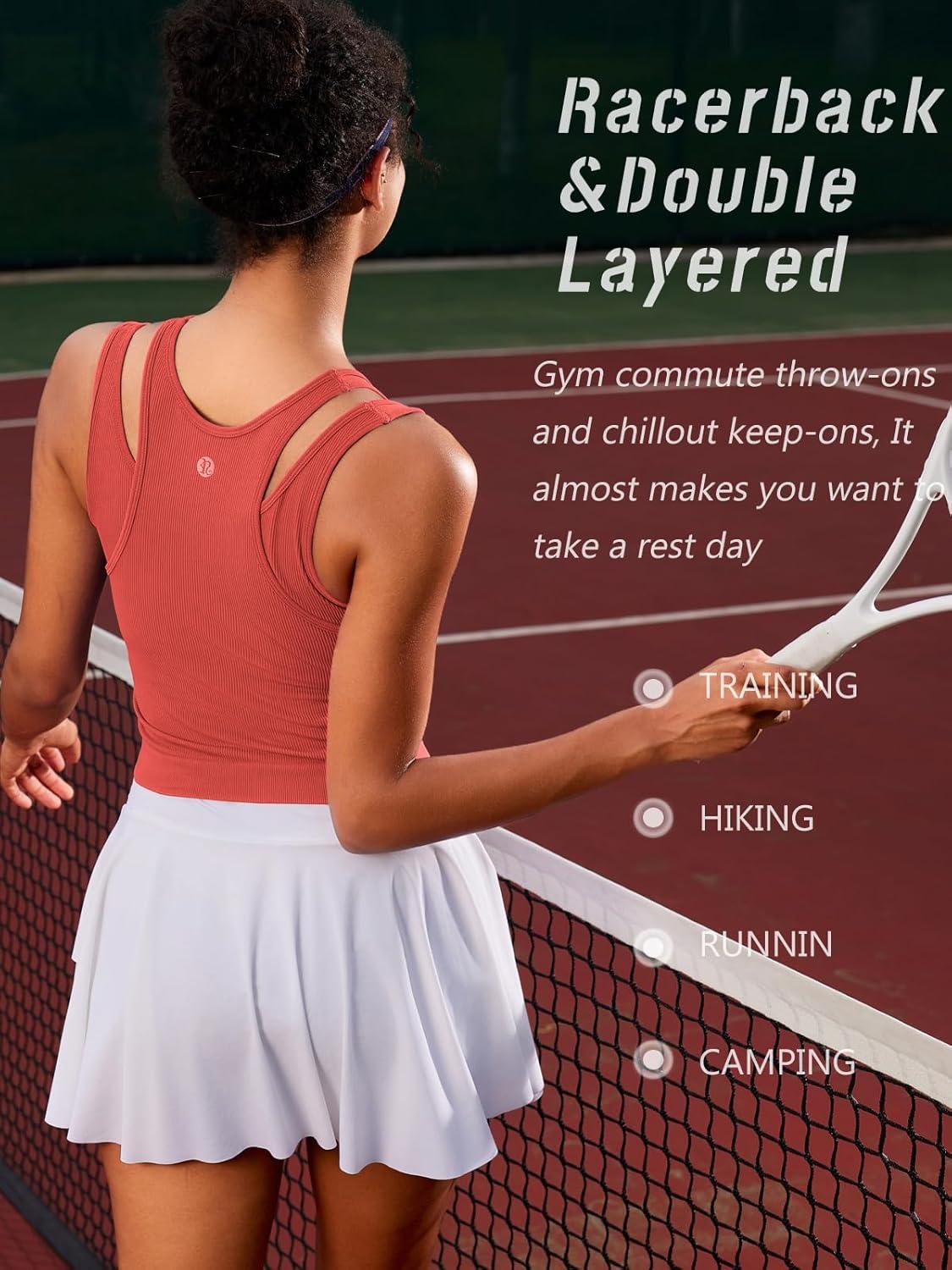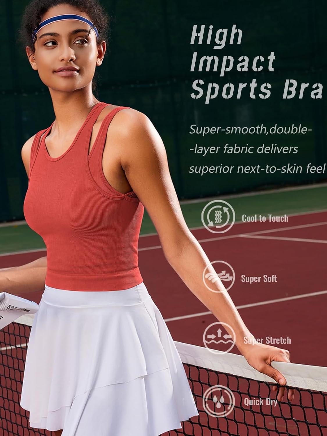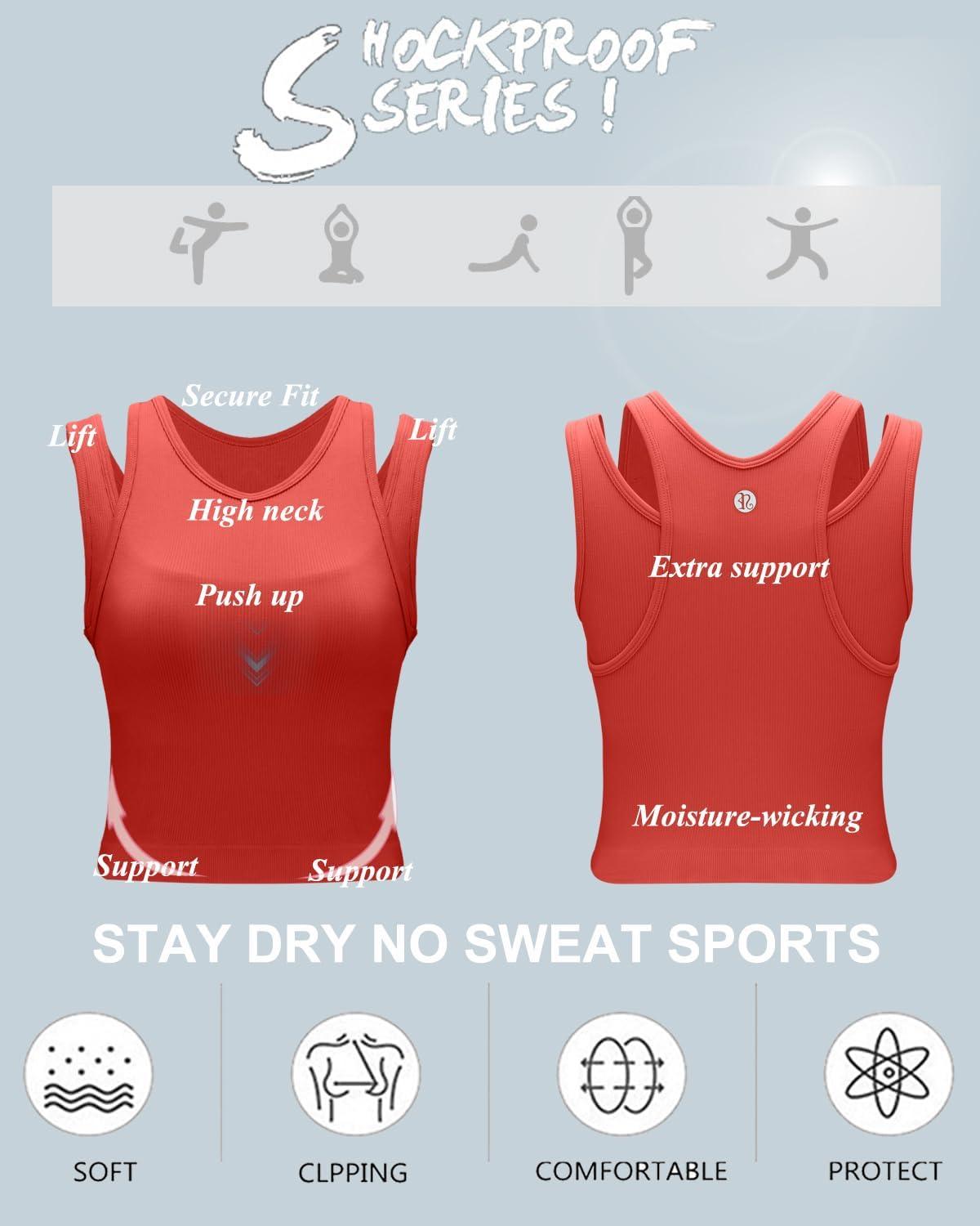 RUNNING GIRL Sports Bras for Women High Impact Seamless Ribbed Longline High Neck Workout Crop Tank Tops Padded(B-red)