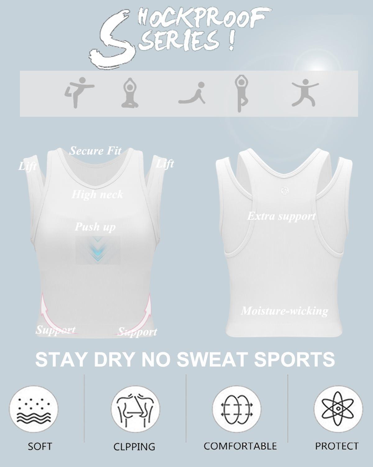 RUNNING GIRL Sports Bras for Women High Support,Seamless Ribbed Longline High Neck Sports Bra Racerback Padded Crop Top Yoga(C-white)