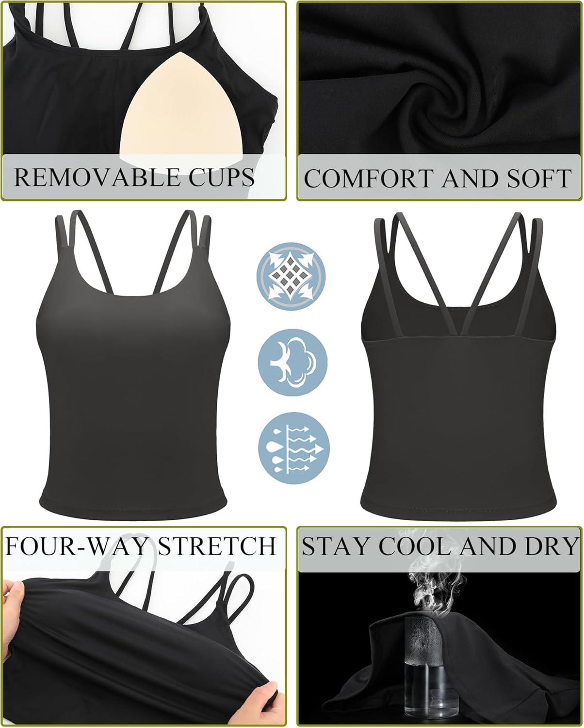 RUNNING GIRL Yoga Tank Tops for Women Built in Shelf Bra B/C Cups Strappy Back Activewear Workout Compression Tops(D-black)