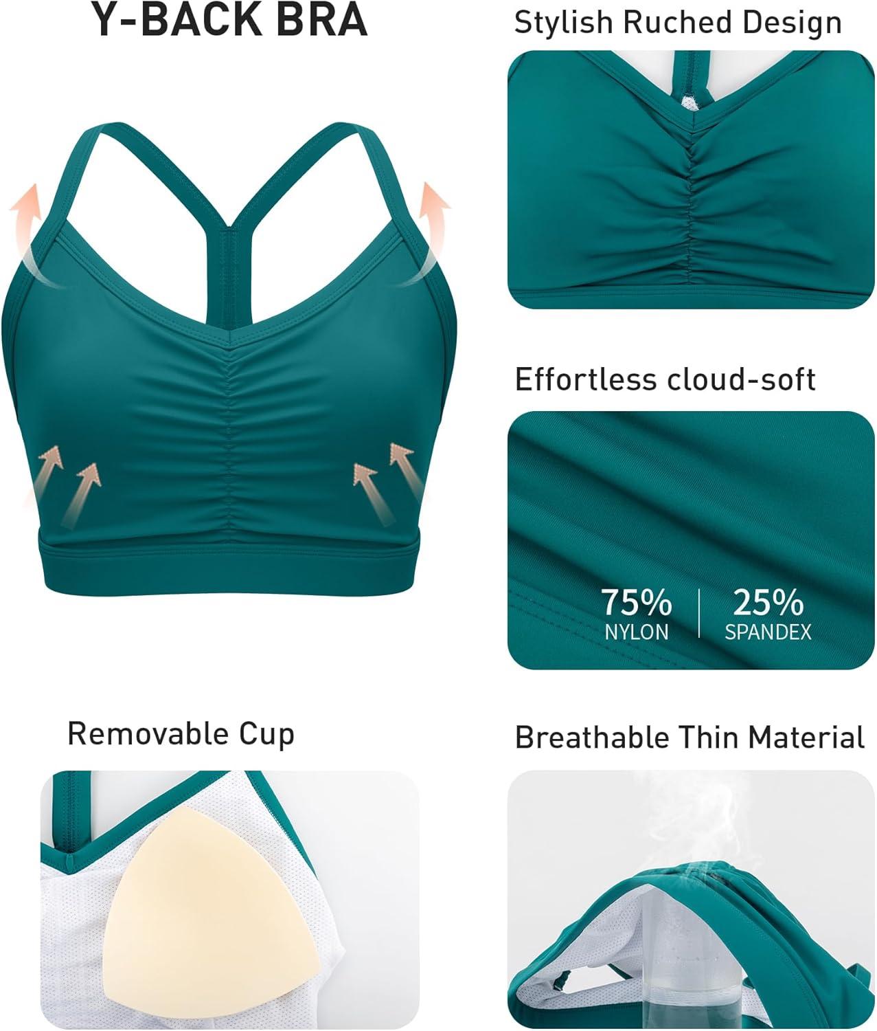 RUNNING GIRL Sports Bra for Women Ruched V Neck – Y Back Spaghetti Thin Strap Wireless Padded Medium Support Yoga Crop Top_WX3094_Dark Green_S