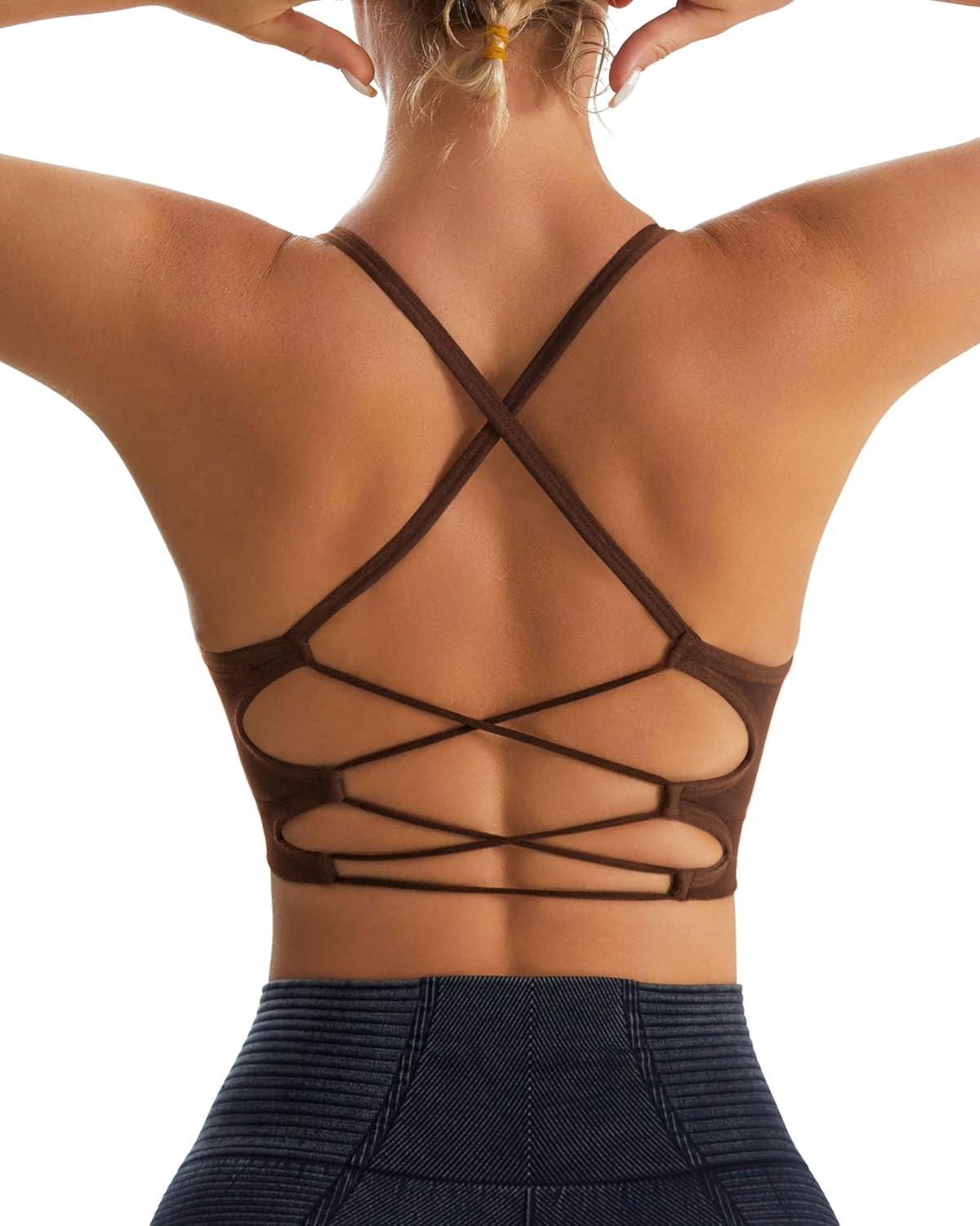 RUNNING GIRL Sports Bras for Women,Sexy Crisscross Back Seamless Padded Sports Bra Medium Support with Removable Pads(Brown)